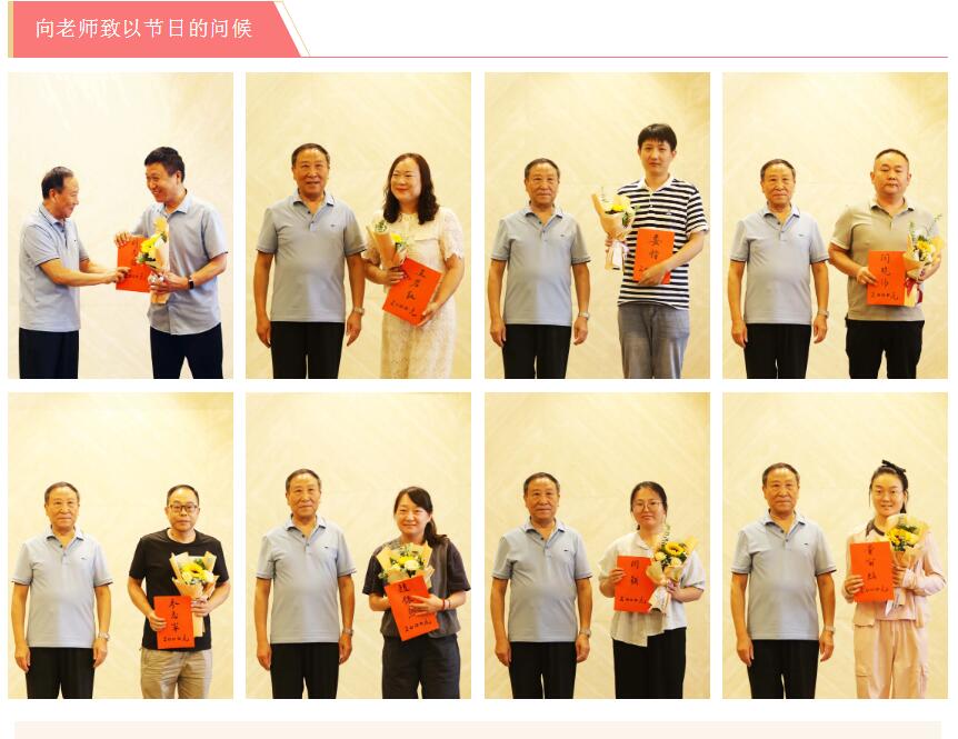 森源集团常务副总裁、榆林森源希望学校基金会副理事长杨合岭代表集团董事局主席、榆林森源希望学校基金会理事长楚金甫向教职员工们送上鲜花和祝福,并颁发慰问金,感谢他们的辛勤付出。