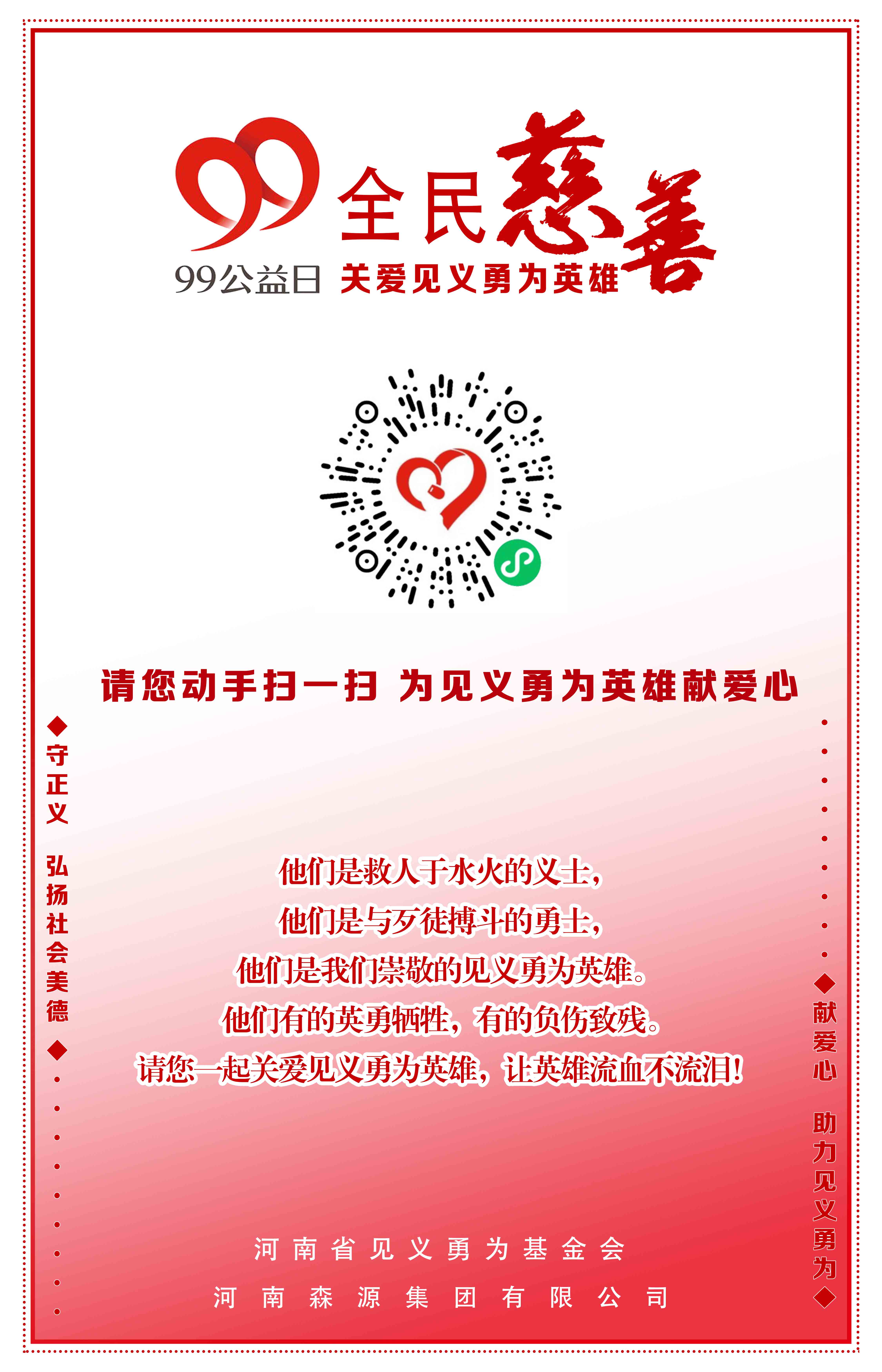9月5日是中华慈善日,“99公益日”是腾讯公司响应国家中华慈善日号召开展的网上募捐活动,是全国性、全民性慈善活动之一。河南省见义勇为基金会积极参与和组织开展这次活动,森源集团是河南省见义勇为基金会理事单位之一;响应国家号召,支持公益,传播社会正能量,森源集团积极参加“99公益日”助力见义勇为爱心捐赠活动。