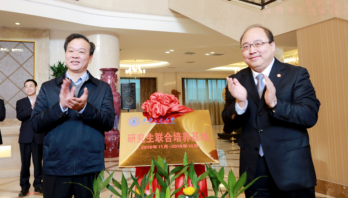 许昌市市长胡五岳、西安交大党委副书记宫辉共同为研究生联合培养基地揭牌;西安交大研究生院培养办公室主任郭炜、森源集团副总裁乔清周分别代表双方签订研究生联合培养基地合作协议。
