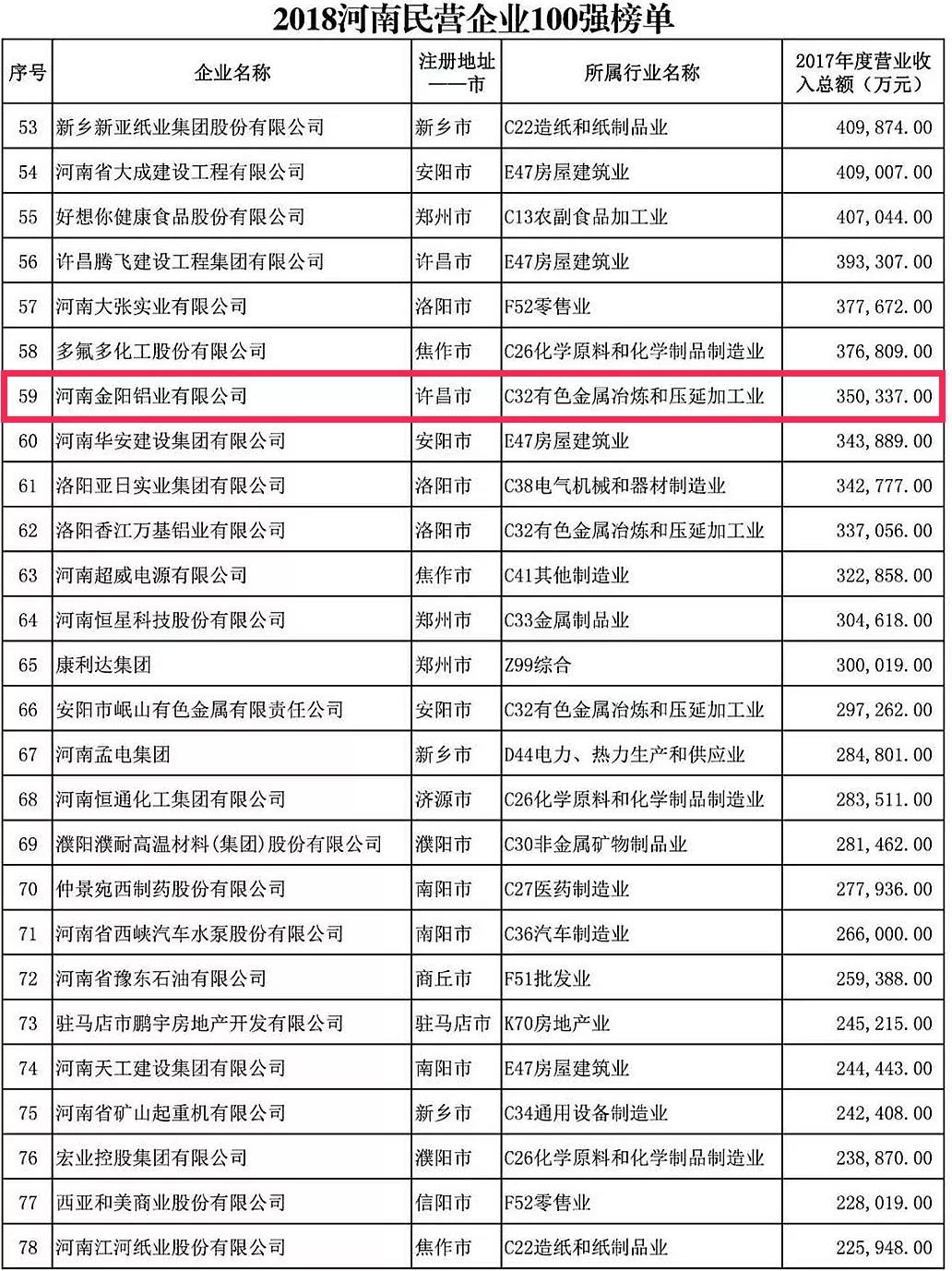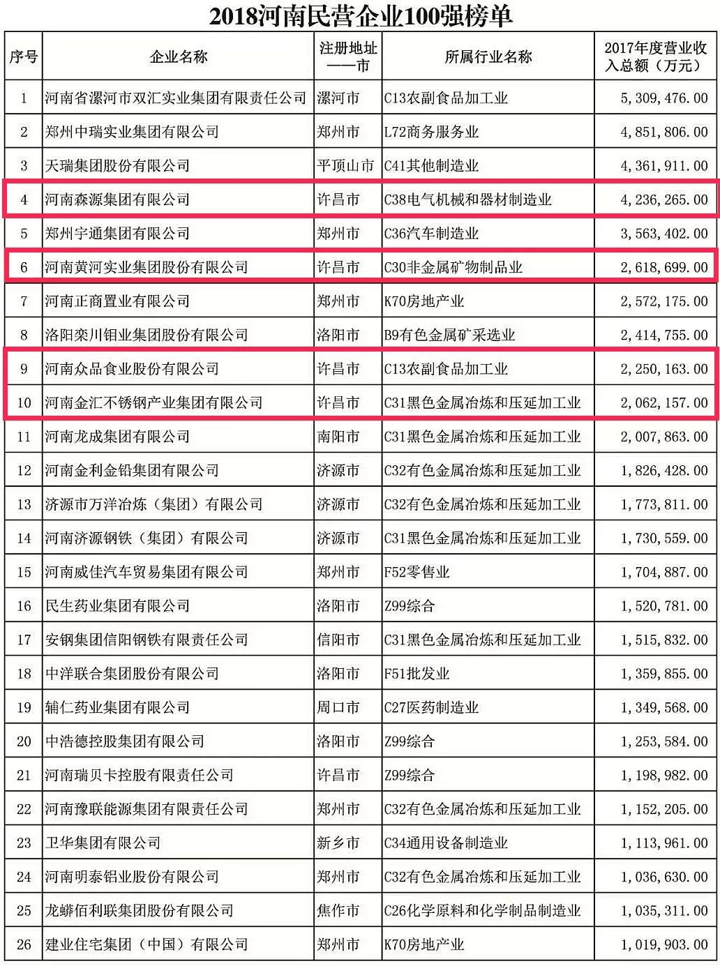 2018“河南民营企业制造业100强”榜单中,森源集团、黄河集团、众品食业、金汇集团和金阳铝业分别排在第3名、第5名、第6名、第7名及第39名。
