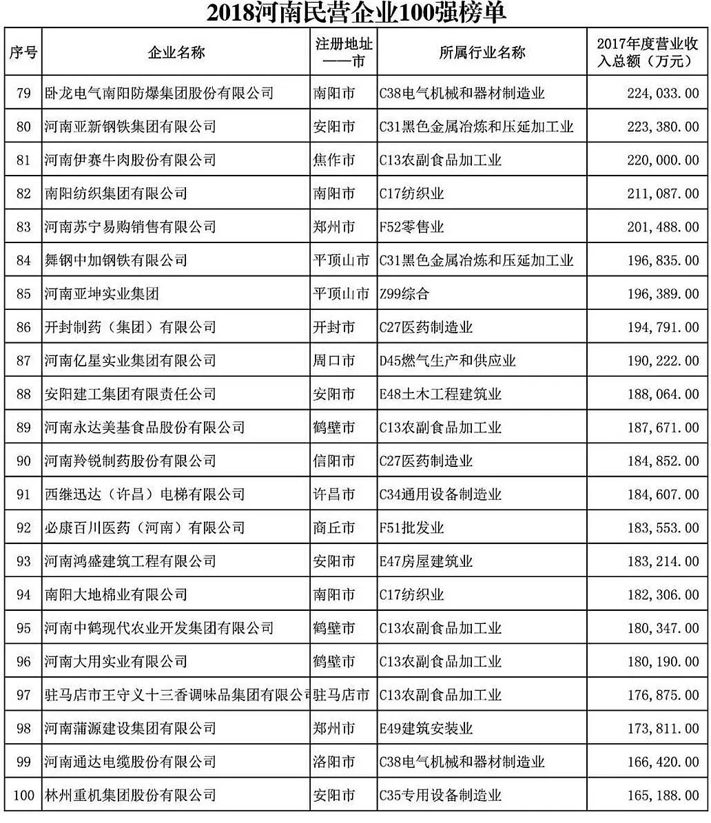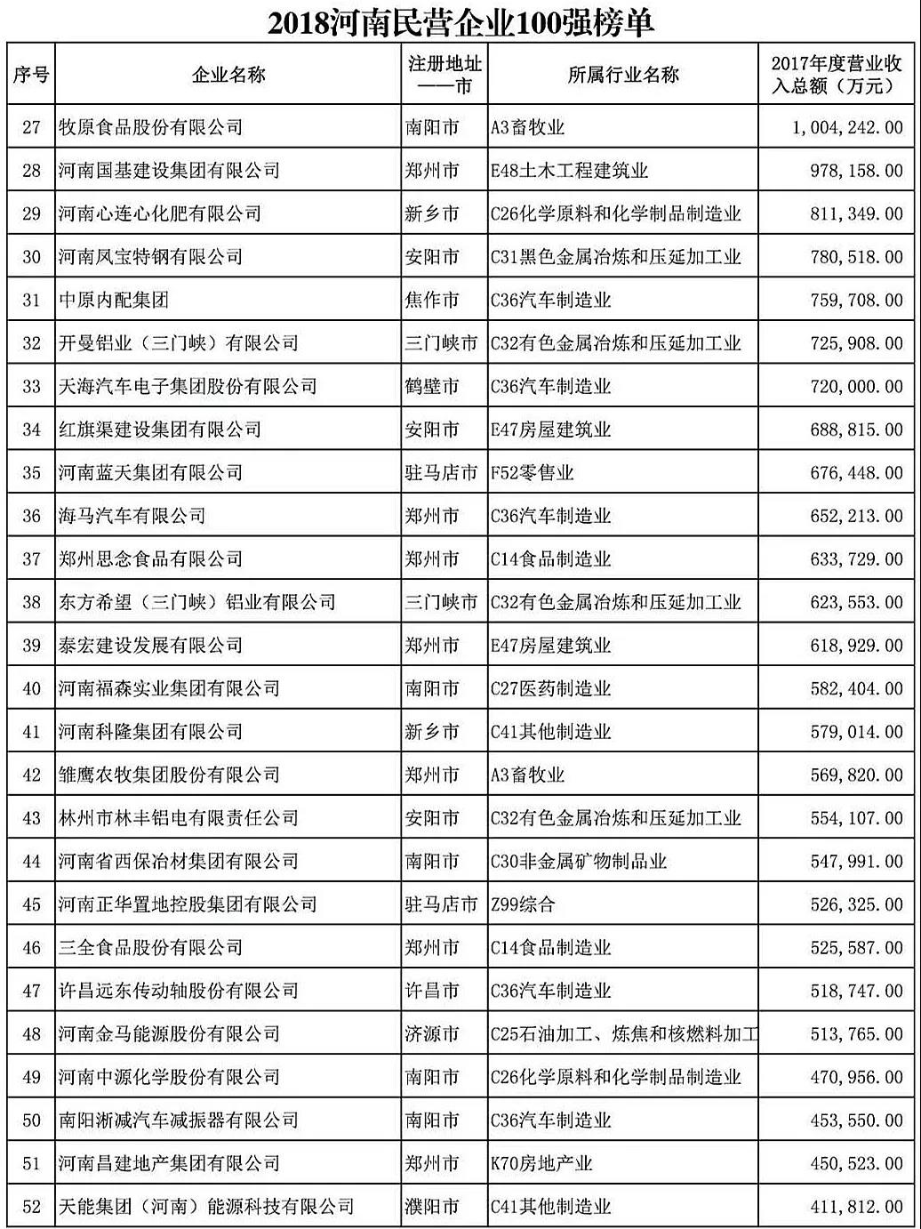 2018“河南民营企业100强”前十强分别是:河南省漯河市双汇实业集团有限责任公司、郑州中瑞实业集团有限公司、天瑞集团股份有限公司、三亿注册线上平台、郑州宇通集团有限公司、河南黄河实业集团股份有限公司、河南正商置业有限公司、洛阳栾川钼业集团股份有限公司、河南众品食业股份有限公司、河南金汇不锈钢产业集团有限公司。