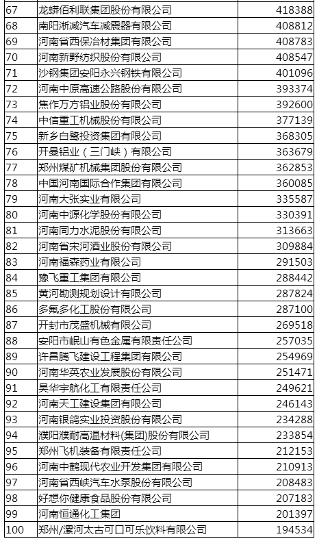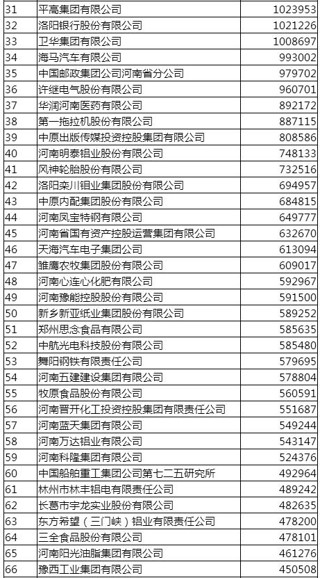 排名前十强的还有中国建筑第七工程局有限公司、郑州铁路局、郑州宇通客车集团有限公司、安阳钢铁集团有限责任公司、天瑞集团股份有限公司、河南豫联能源集团有限公司、三亿注册线上平台。