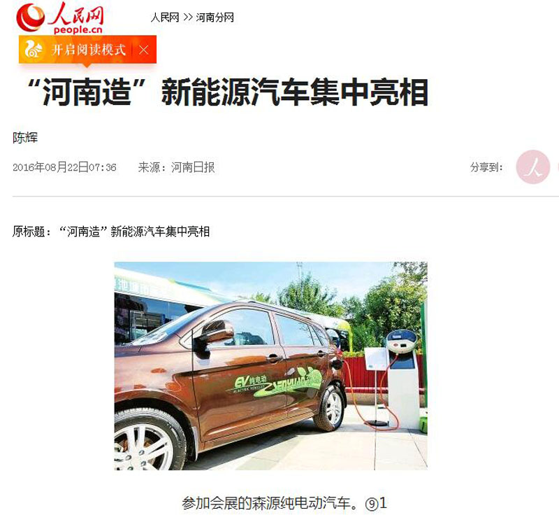 中央权威媒体人民网对此进行了报道,在中国电动汽车百人会夏季论坛上,森源集团带来了自己的多款车型,着力打造新能源发电、智能充电、电动车辆三位一体的产业发展模式,成为了中国电动汽车百人会夏季论坛一道独特亮丽的风景。