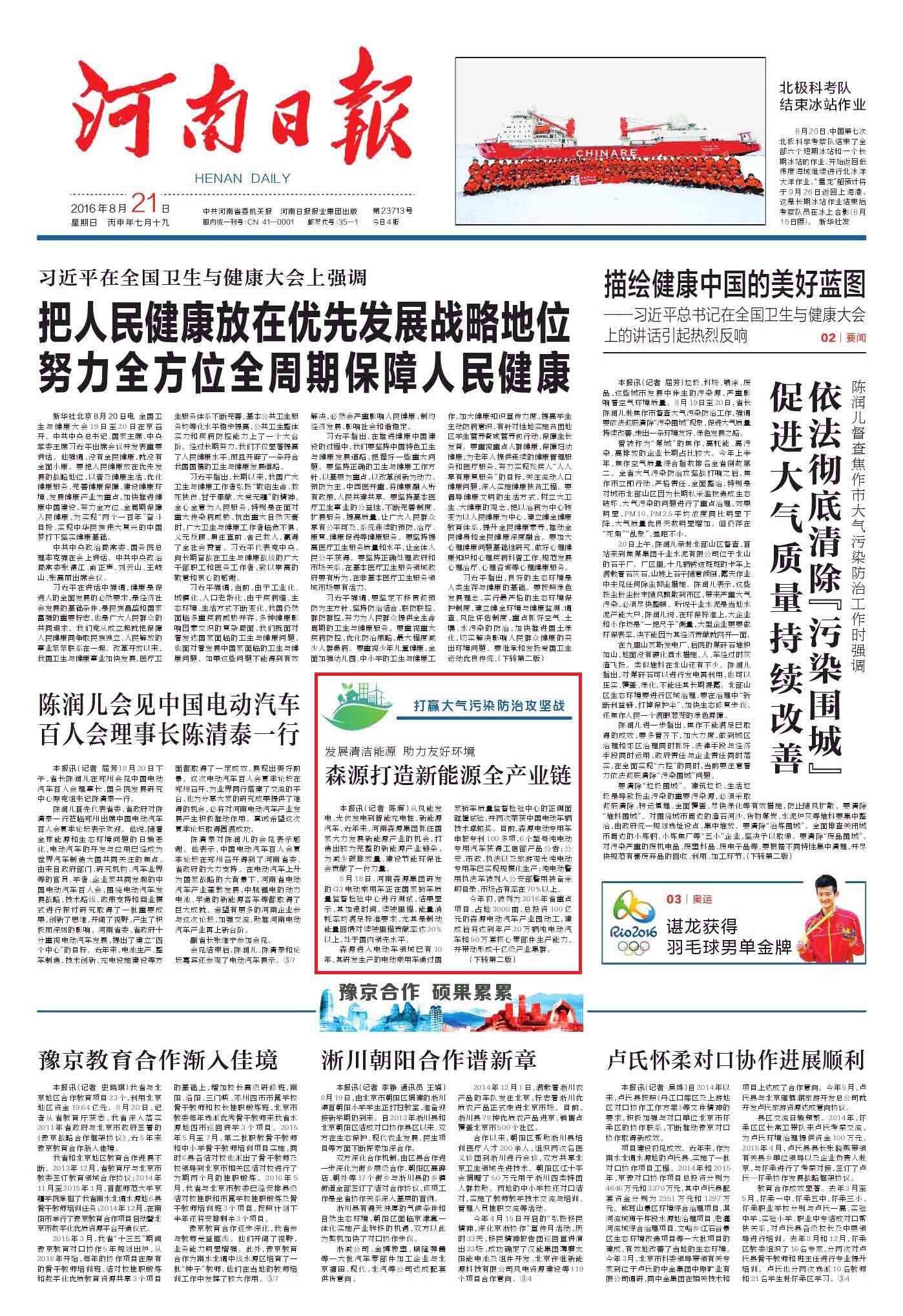 8月21日,《河南日报》头版以《发展清洁能源助力友好环境森源打造新能源全产业链》为题,对森源集团的发展情况进行了专题报道。文章指出:“从风能发电、光伏发电到智能充电桩、新能源汽车,近年来,河南森源集团抓住国家大力发展新能源产业的机会,打造出较为完整的新能源产业链条,为减少碳排放量、建设节能环保社会贡献了一份力量。”