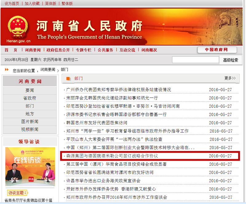 河南省人民政府门户网站河南要闻——森源集团与德国魏德米勒公司签订战略合作协议 发布日期: 2016-05-28 分享 加入收藏 5月27日,河南省人民政府门户网站河南要闻栏目发布新闻《森源集团与德国魏德米勒公司签订战略合作协议》。 原文链接:http://www.henan.gov.cn/jrhn/system/2016/05/27/010644282.shtml 上一条 许昌电视台对森源集团与德国魏德米勒公司签订战略合作协议进行特别报道 2016-05-24 下一条 许昌日报/许昌市人民政府门户网站/许昌电视台——我市第一个山地林光互补光伏发电项目并网发电 李建民出席并网发电仪式 2016-05-31