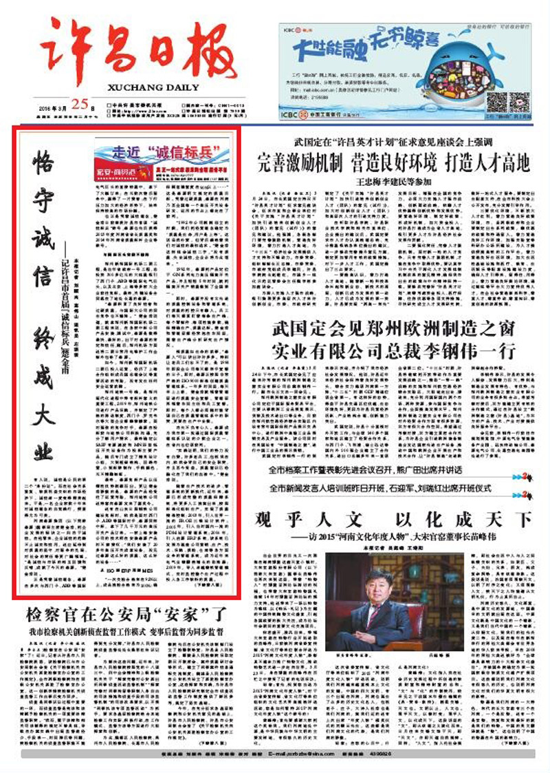 许昌日报头版报道——《恪守诚信 终成大业——记许昌市首届“诚信标兵”楚金甫》